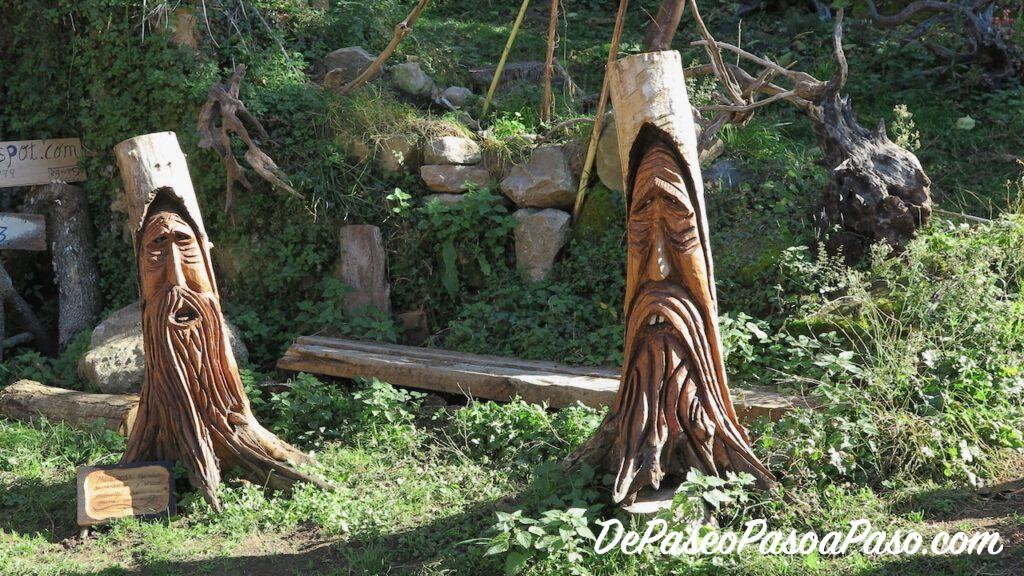 En un momento pensamos que estábamos entrando en una propiedad privada, pero sin embargo el camino pasa entre algunas construcciones y continúa cuesta arriba. Allí vimos algunas esculturas en troncos muy bonitas.