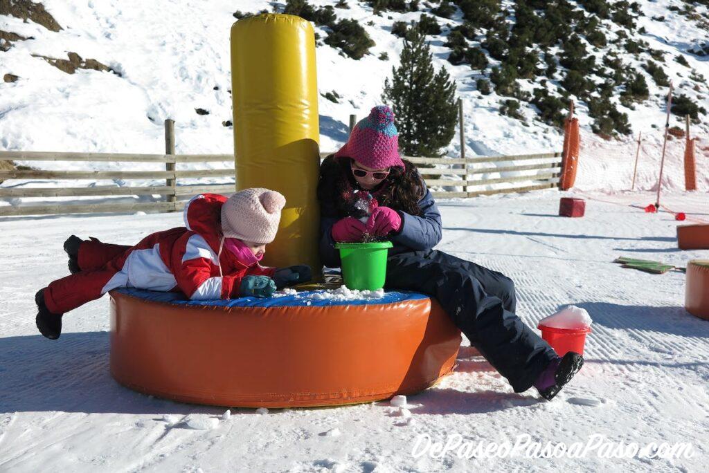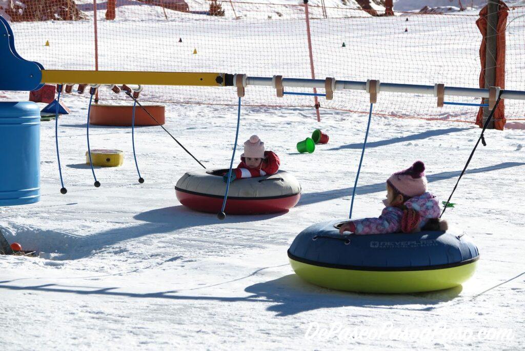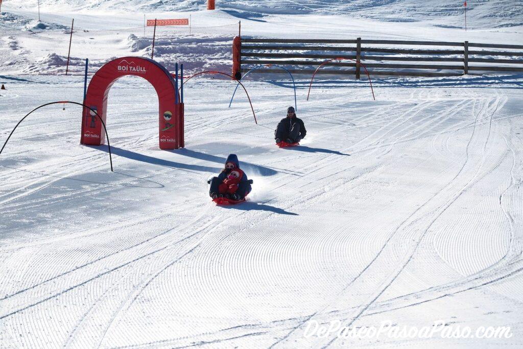 El precio de la zona lúdica de Boí Taüll es de 7 euros por día y niño (pagan solo los niños mayores de 2 años) y tienen acceso a la zona lúdica en donde hay muchos juegos, juegos de playa (nos pareció divertido hacer castillos de nieve jeje), colchonetas, unos donuts giratorios que les encantó (va despacio, es más bien para niños pequeños); y acceso a la pista de trineos que es muy amplia y tiene obstáculos para divertirse aún más! (la pista de trineos solo abre fines de semana y festivos).