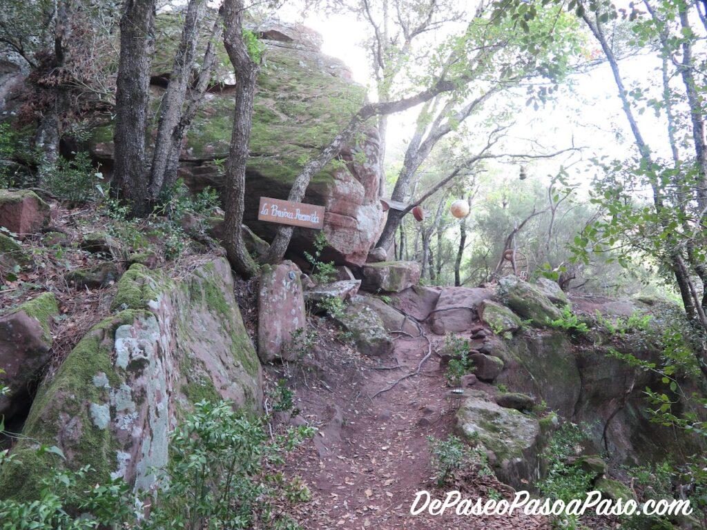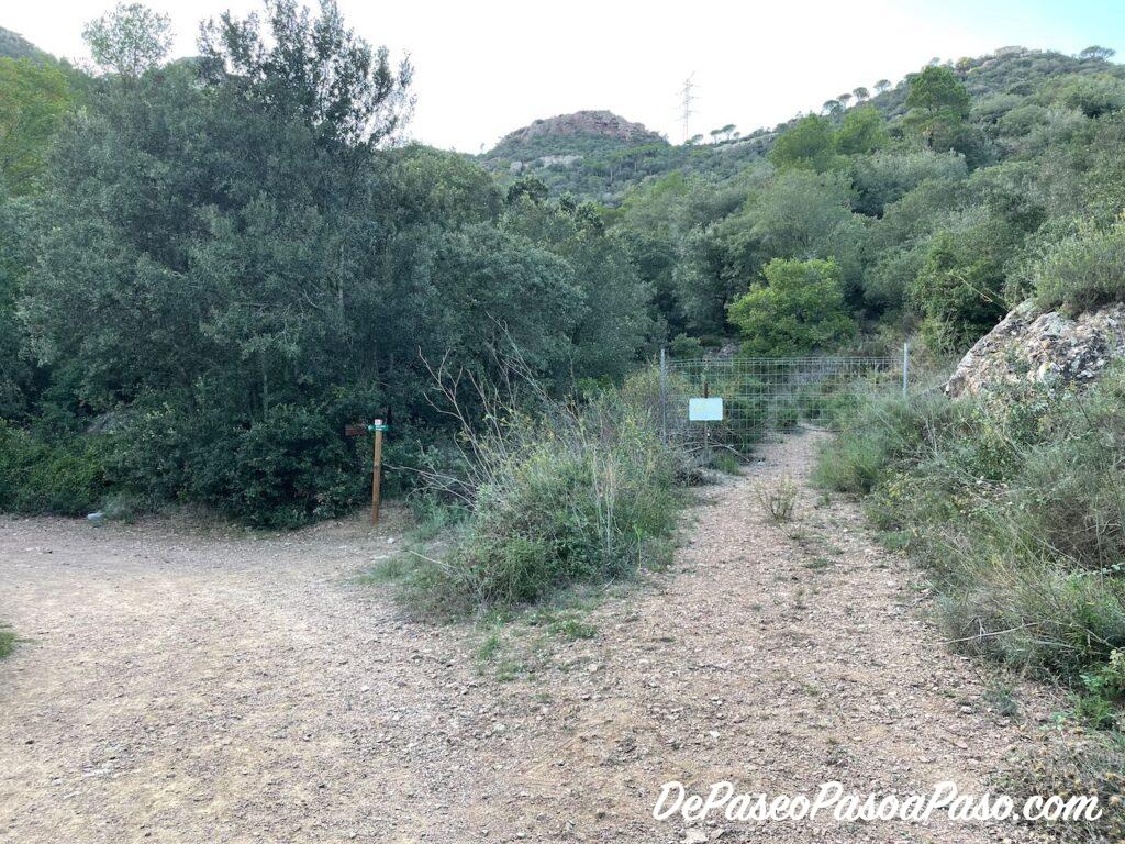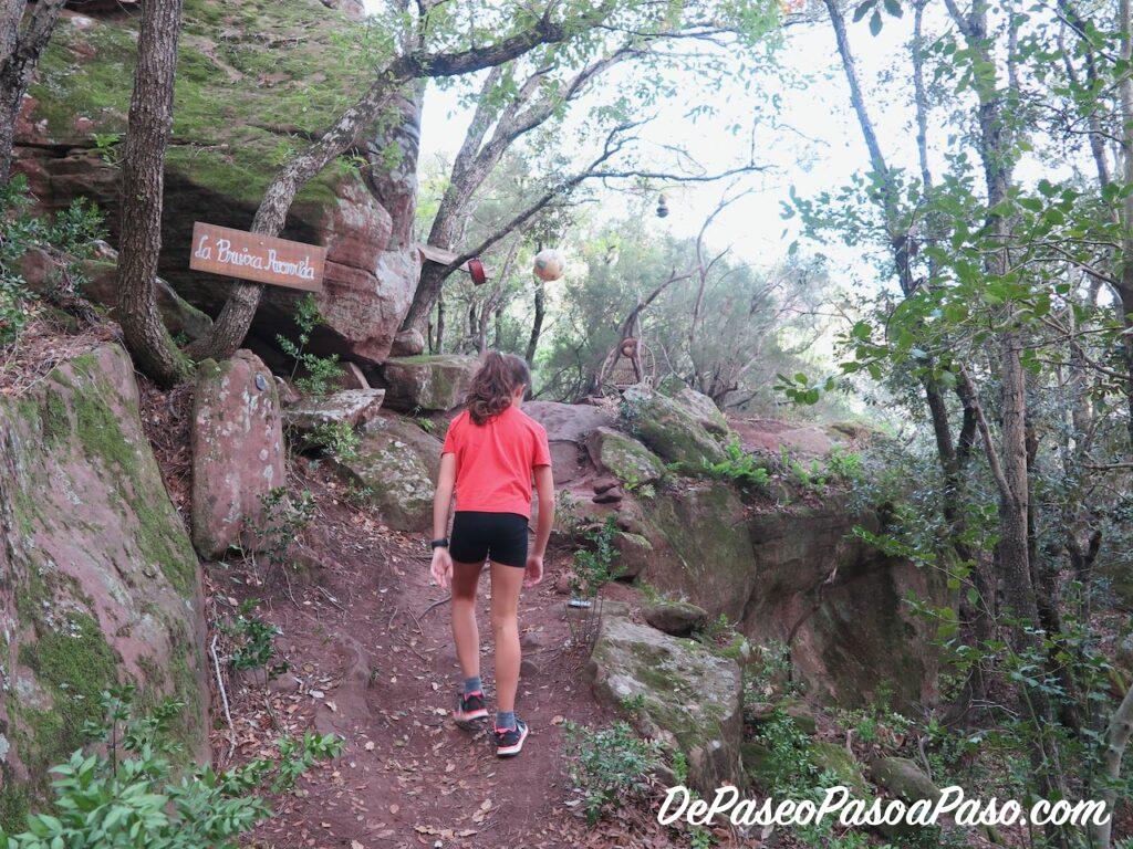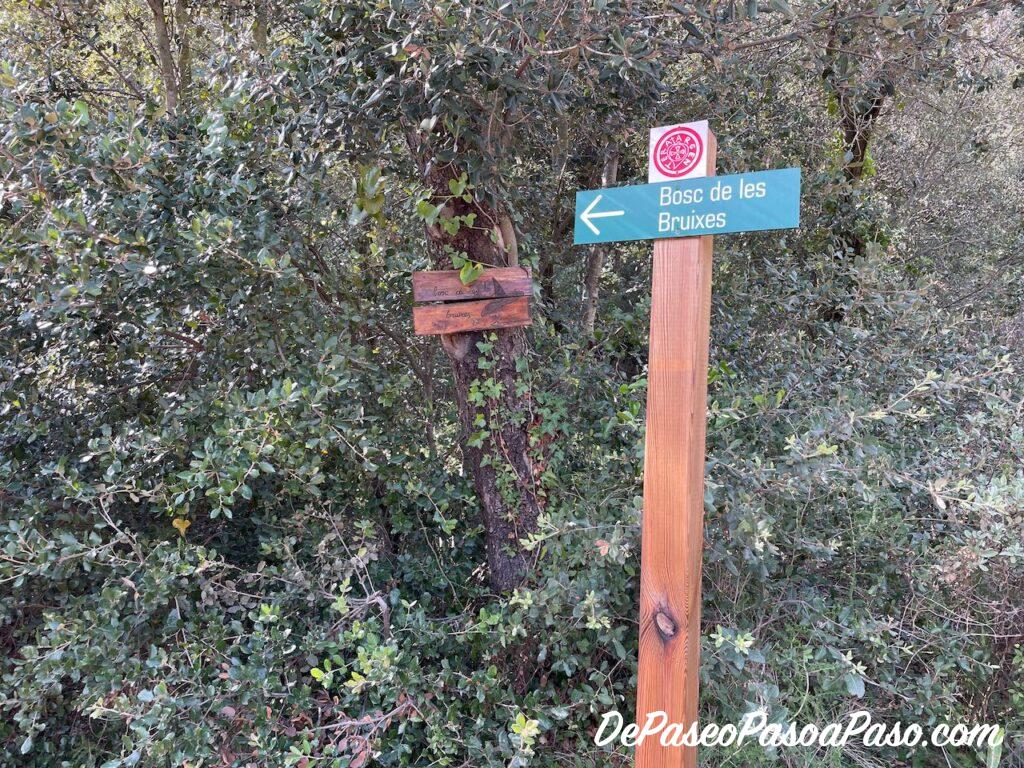 Seguimos por el camino que veníamos andando y al llegar a una gran torre electricidad, nos encontramos con un cartel que nos da la bienvenida al Bosc de les Bruixes, y a partir de ese punto el recorrido se hace por un sendero estrecho dentro del bosque.
