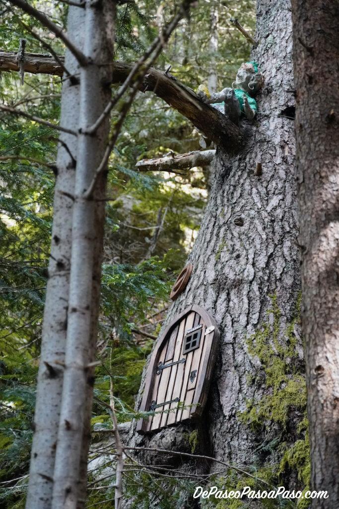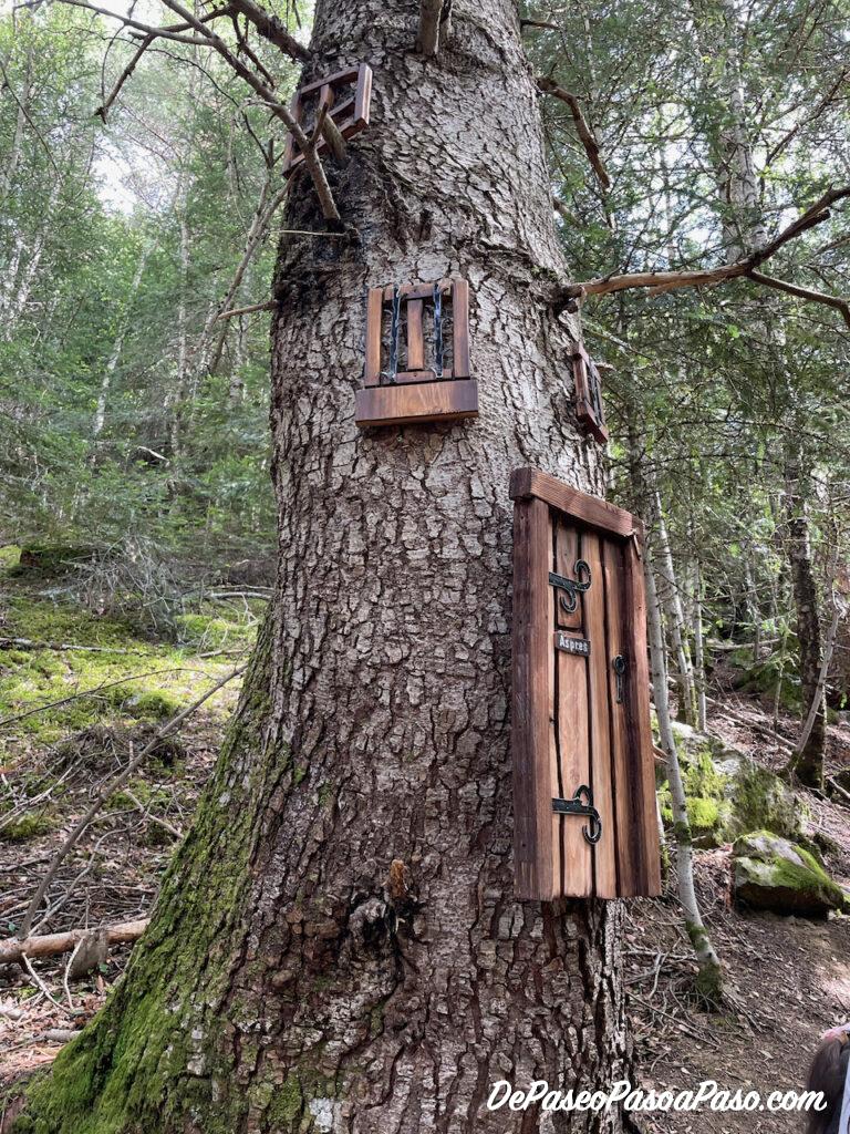 A lo largo del recorrido encontramos la puerta mágica por la que entramos al bosque de los Menairons, el dragón dormido con la cola llenas de pinchos. Herramientas de trabajo de los Menairons, casas escondidas en los arboles, figuras de los duendecillos que nos miran desde el bosque, y divertidos juegos! Todo esto rodeados de un magnífico entorno!