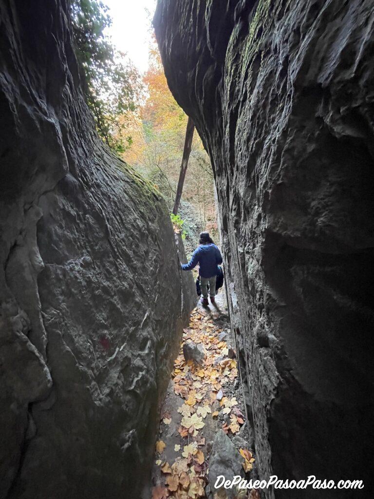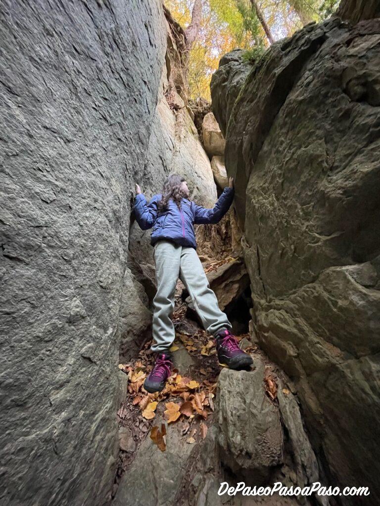 El siguiente desvío no esta bien señalizado, y no es muy fácil de ver… Debes estar atento a un sendero poco marcado que sube sobre una roca en este punto📍.