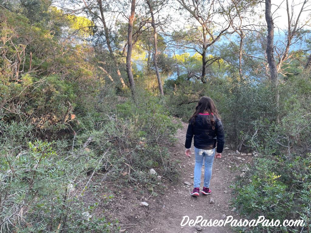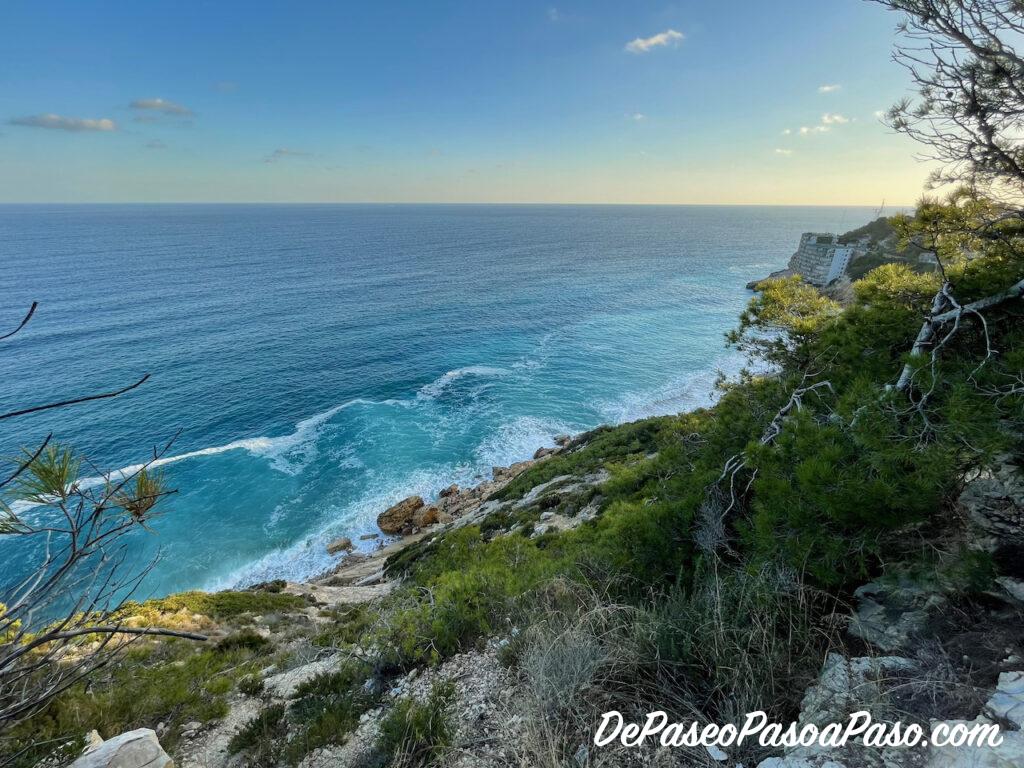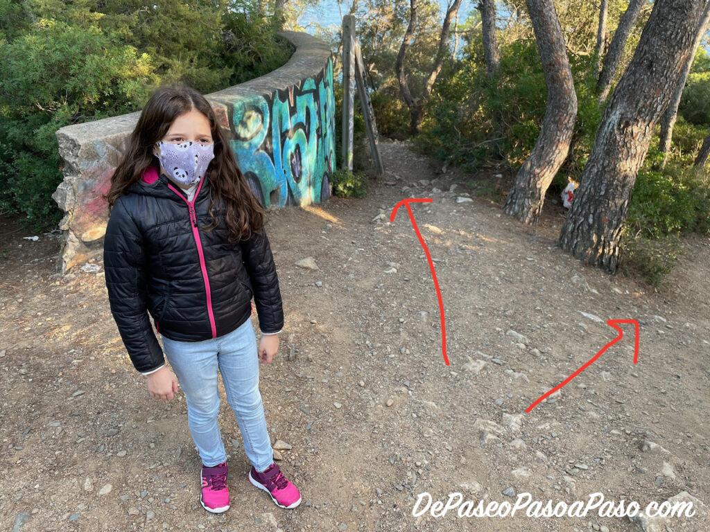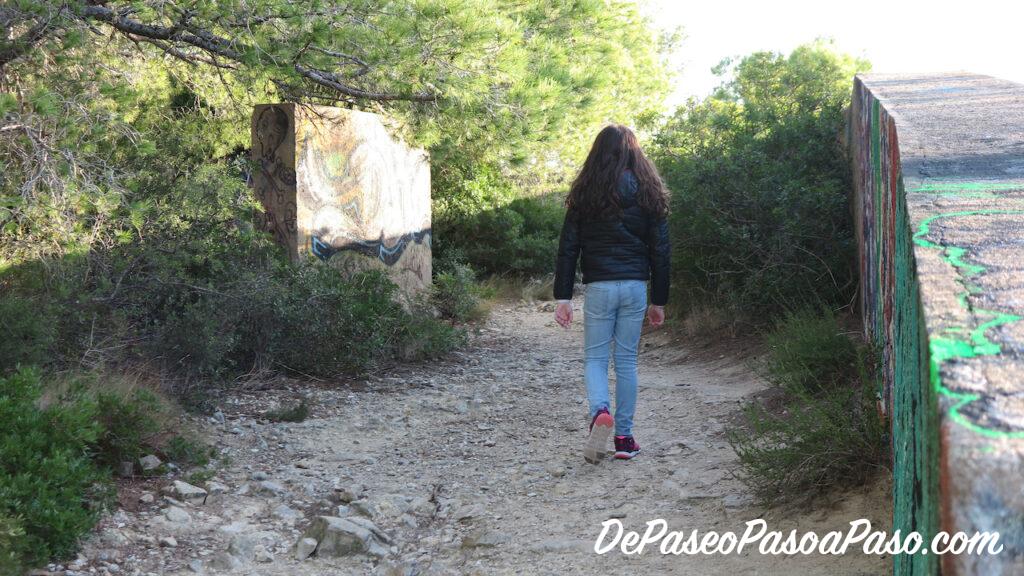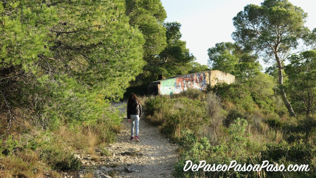 Desde el bunker salen dos senderos, uno hacia la derecha que baja (con alguna zona bastante difícil por la pendiente) a la cala Cova del Lladre, y otro hacia la izquierda que va bordeando los acantilados hasta llegar a la pineda.
