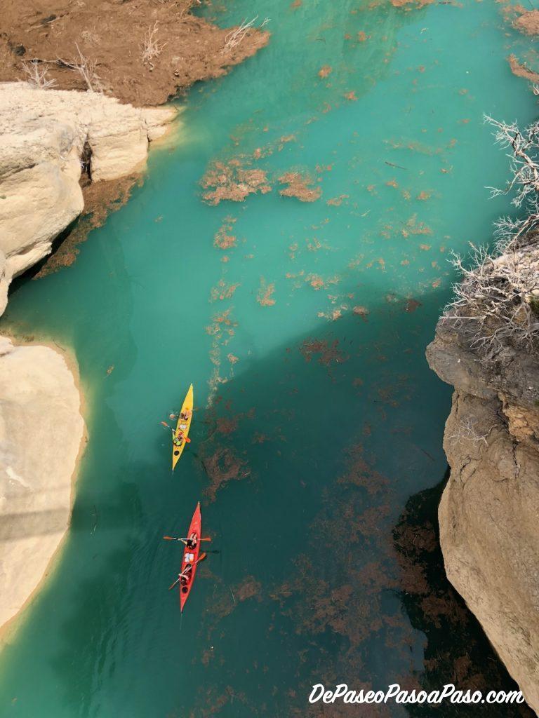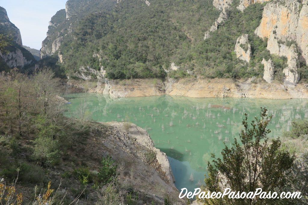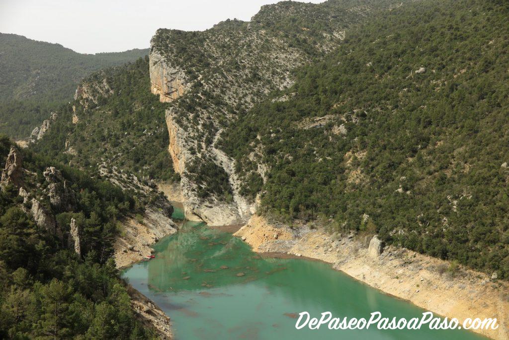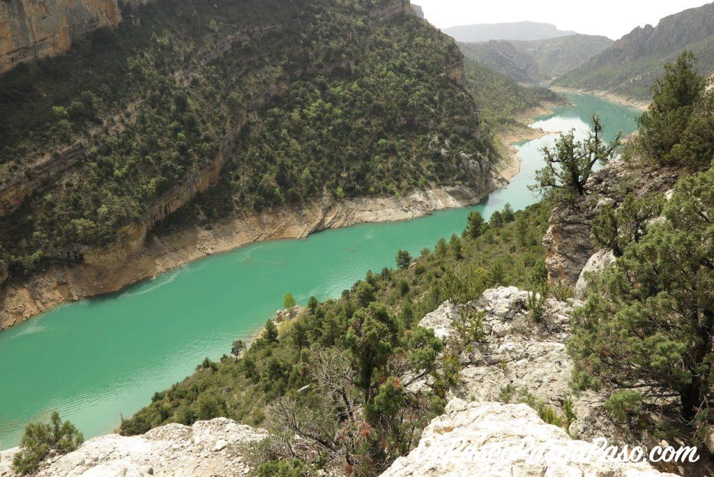 Cuando llegamos al final del desfiladero, y la vista es amplia, podemos apreciar el color azul esmeralda del río, y vemos que el camino continua por una pista con más vegetación.