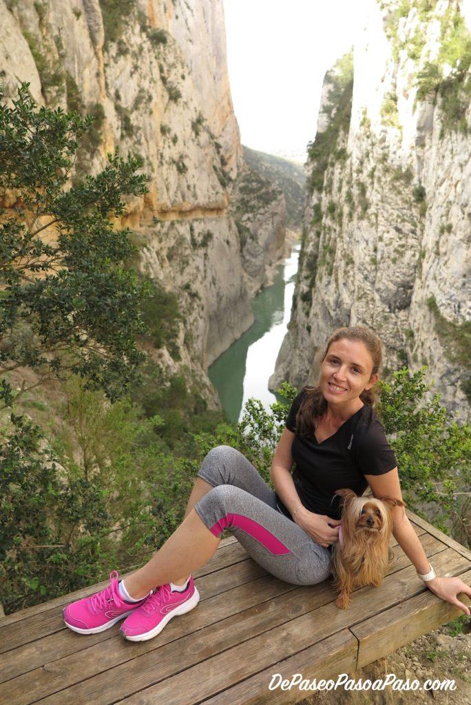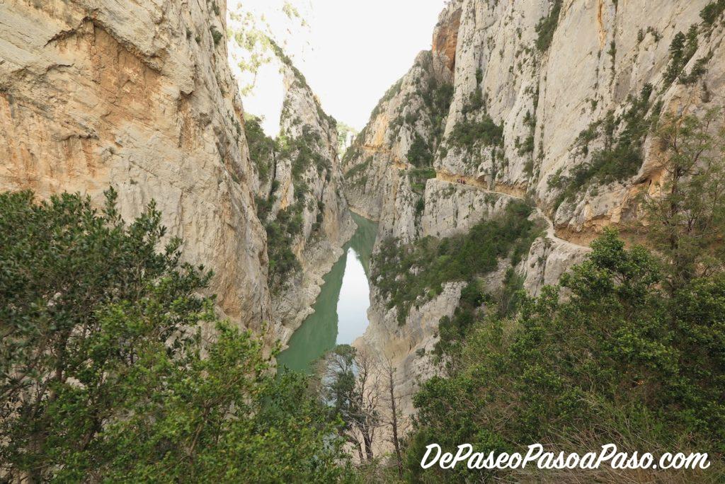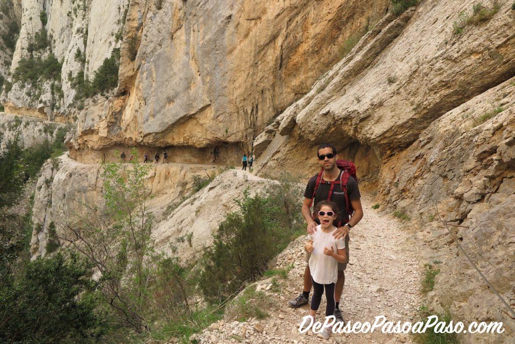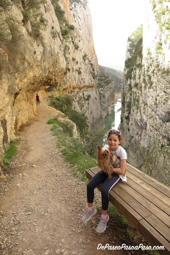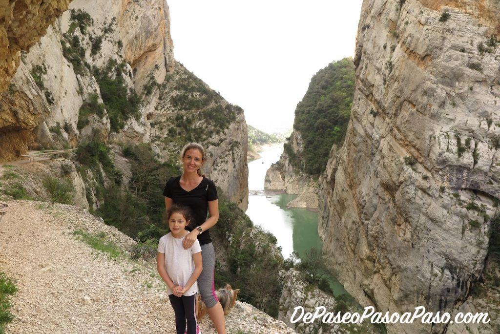 Luego de cruzar el primer puente, que es toda una aventura para los niños, continuamos por un sendero con más vegetación hasta llegar a la zona donde comienza el desfiladero. En este punto el paisaje cambia, lo que predomina es la vista de acantilado y las paredes verticales alzándose a ambos lados del río, formando el Congost de Mont-rebei📍.