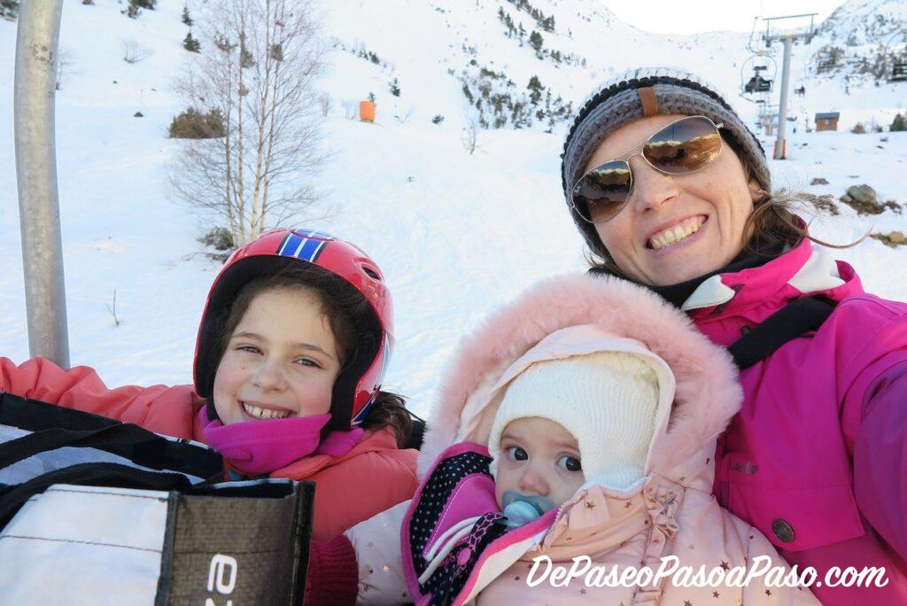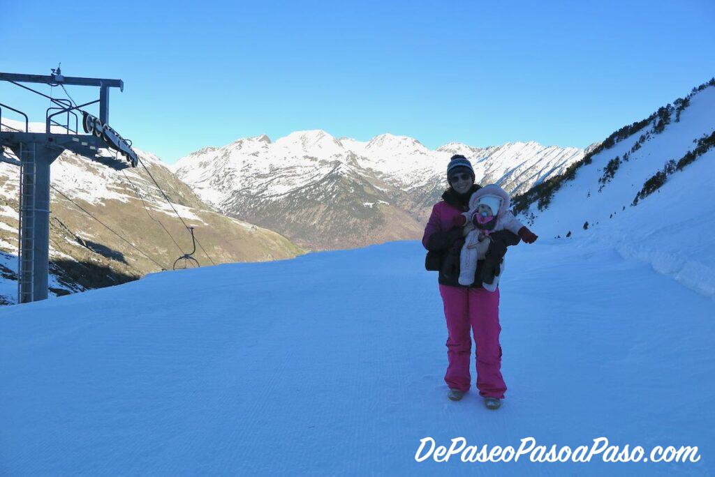 Subimos todos juntos en telesilla hasta la zona de Telesquí (zona verde), allí Fabian y Mahia practicaron un buen rato mientras yo sacaba fotos como podía, con Kiara en brazos, jeje