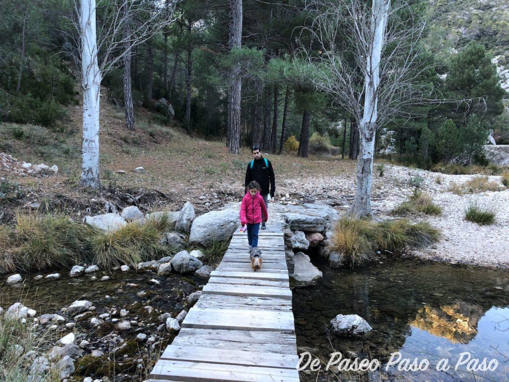 El sendero nos lleva a cruzar el río varias veces, saltando de orilla a orilla entre pasarelas, puentes y rocas.