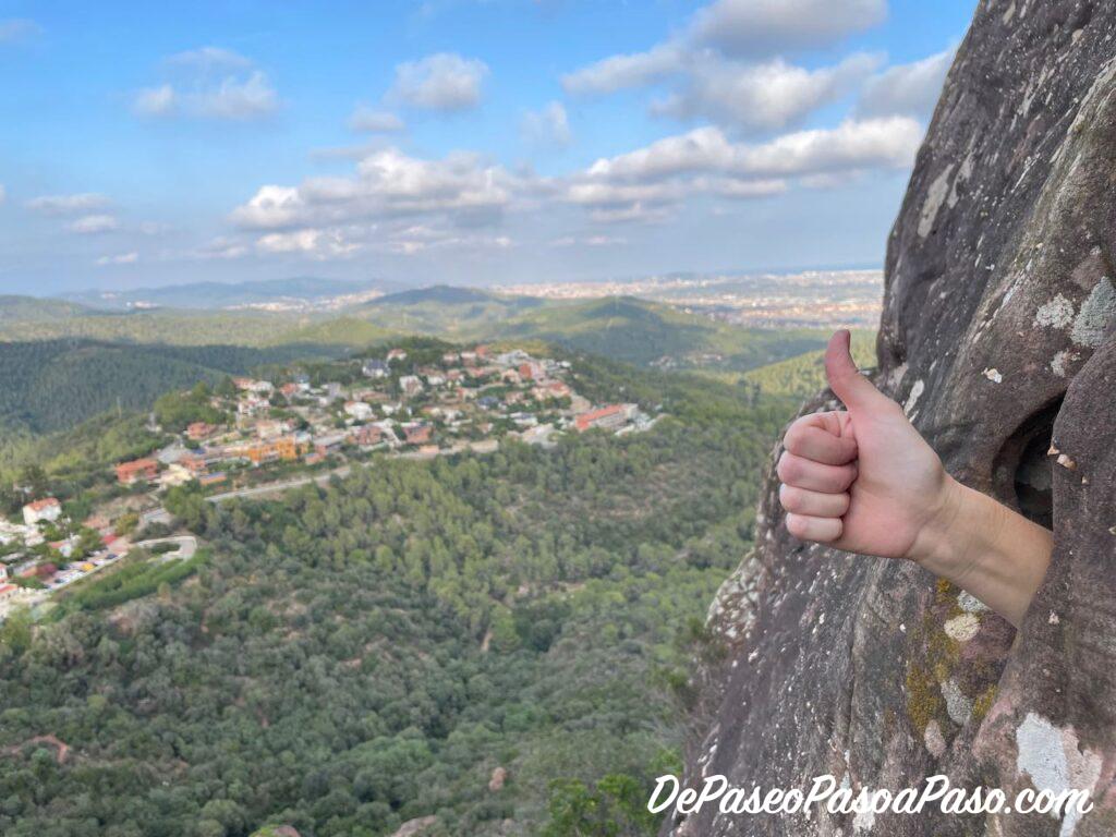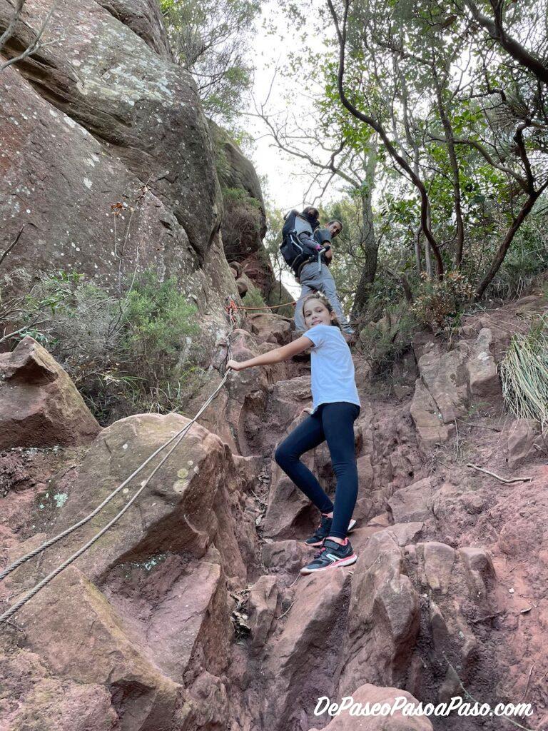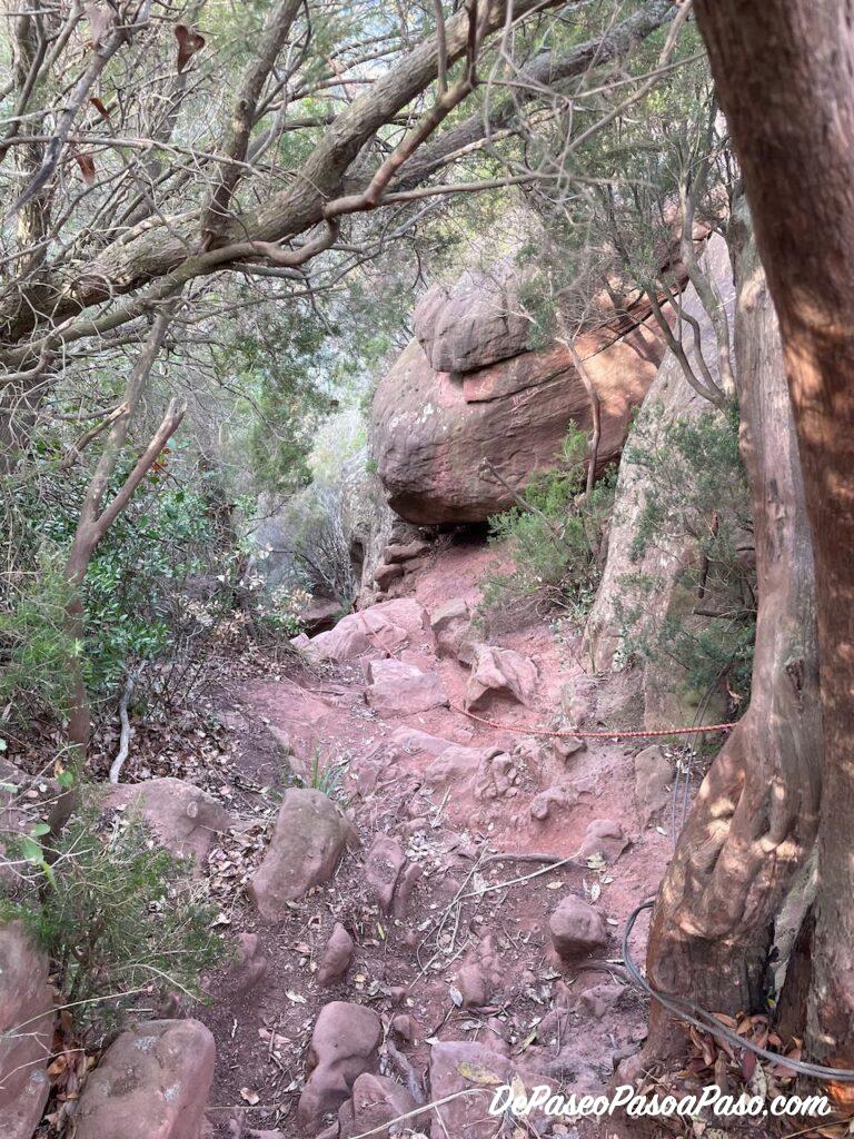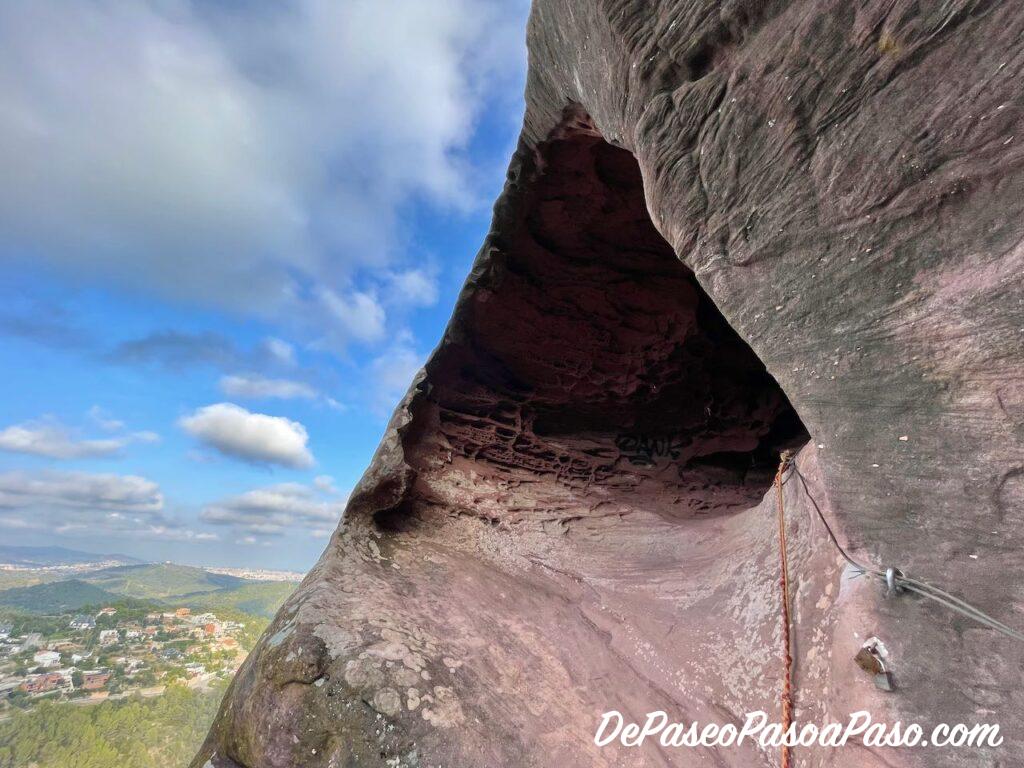 Volviendo unos pasos hacia atrás desde la ultima foto, encontramos el camino que baja hacia la Cova de Bruguers📍, justo al lado de esta roca. Ésta es la parte más complicada del trayecto, pero con precaución y gracias a la ayuda de las cuerdas que hay instaladas, se realiza sin problema. Y agrega un plus de aventura al paseo!