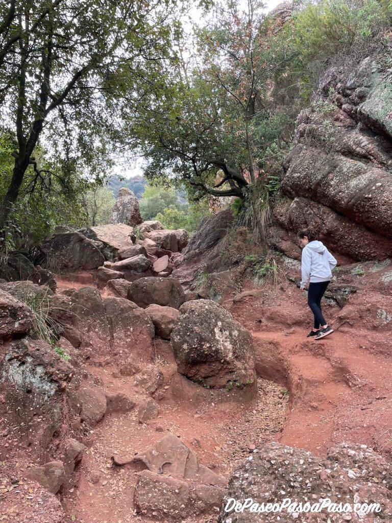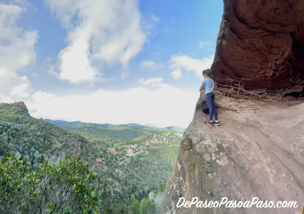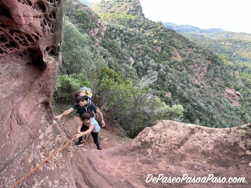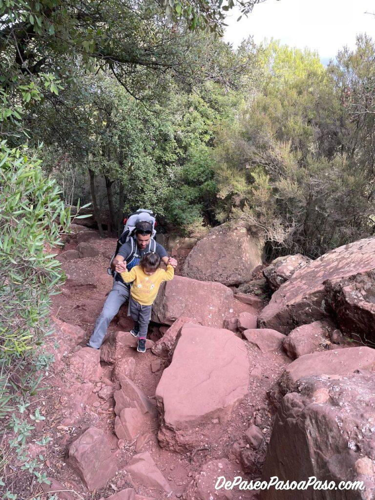Volviendo unos pasos hacia atrás desde la ultima foto, encontramos el camino que baja hacia la Cova de Bruguers📍, justo al lado de esta roca. Ésta es la parte más complicada del trayecto, pero con precaución y gracias a la ayuda de las cuerdas que hay instaladas, se realiza sin problema. Y agrega un plus de aventura al paseo!