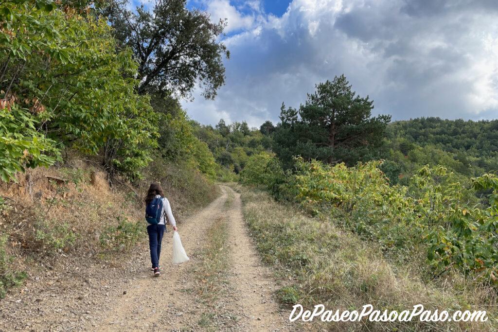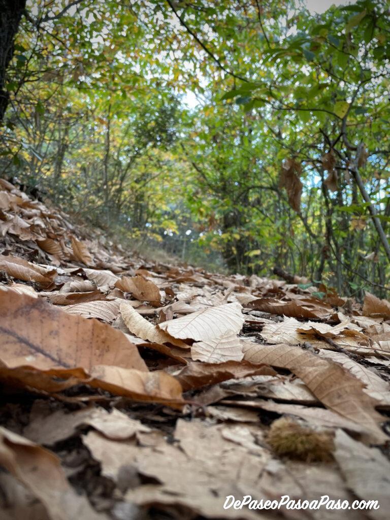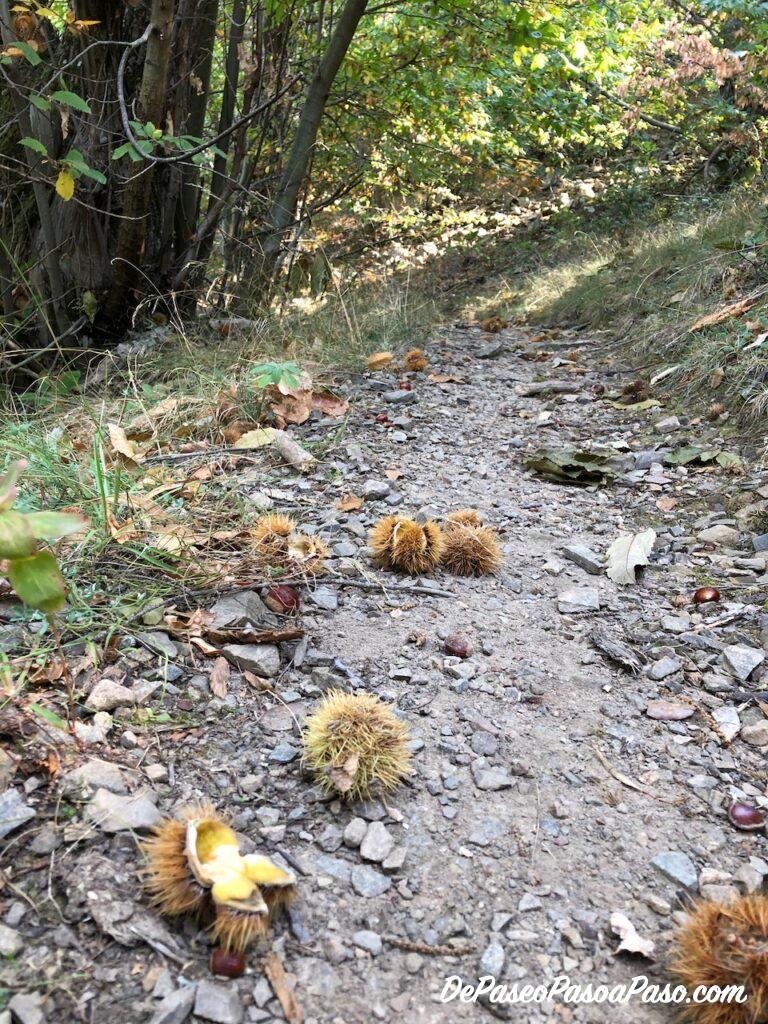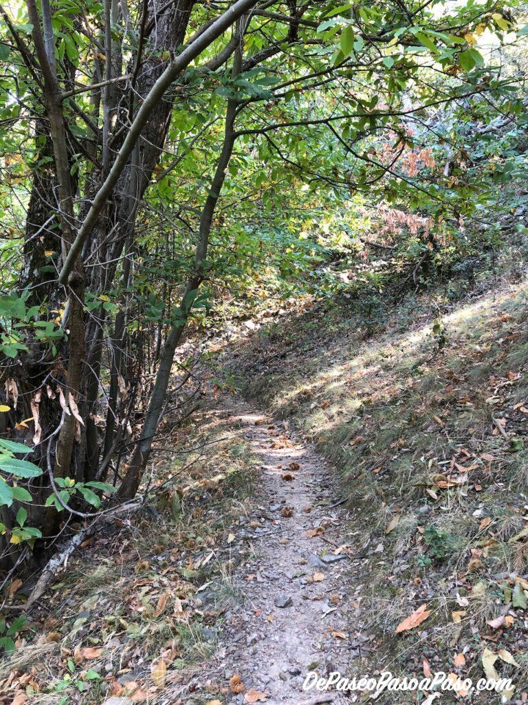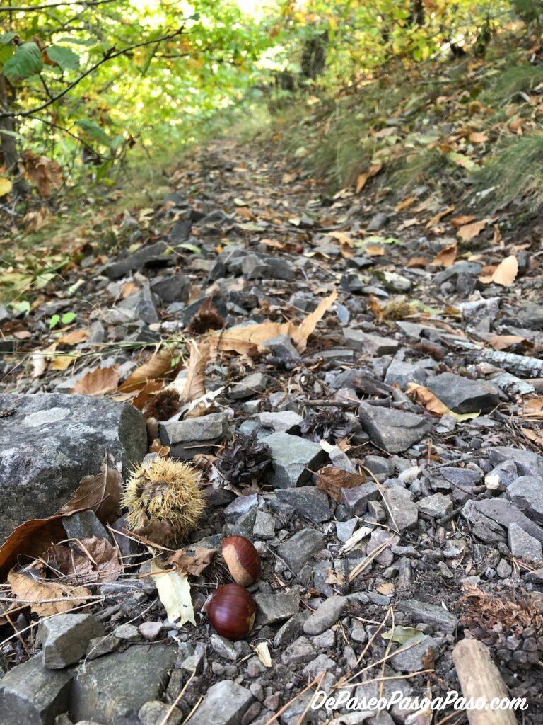 Luego de la primera decisión hacia la derecha, el camino cambia considerablemente, y comenzamos a caminar por dentro del bosque, encontrando los primeros castaños.
