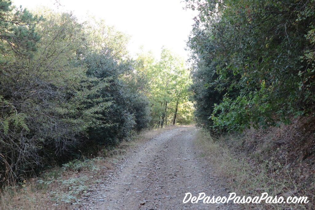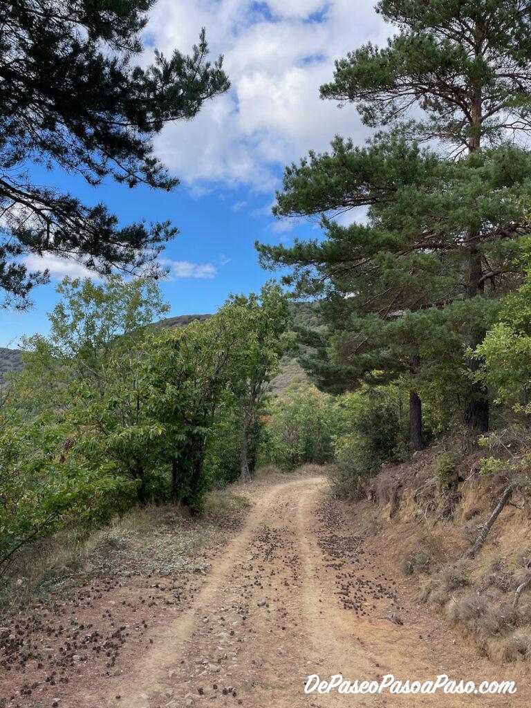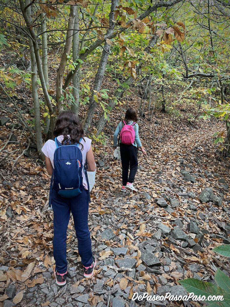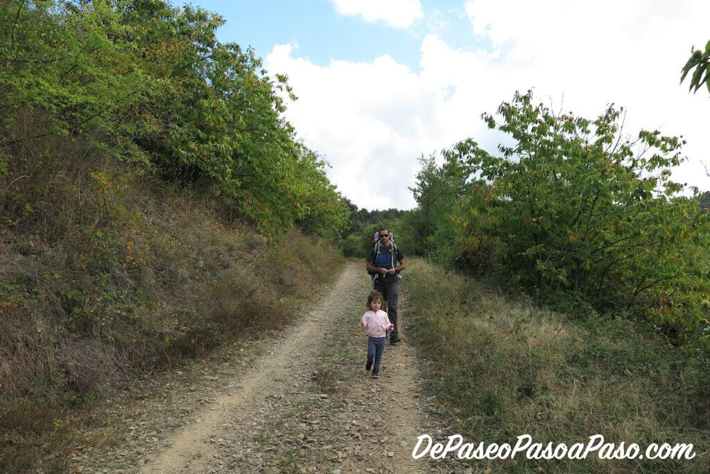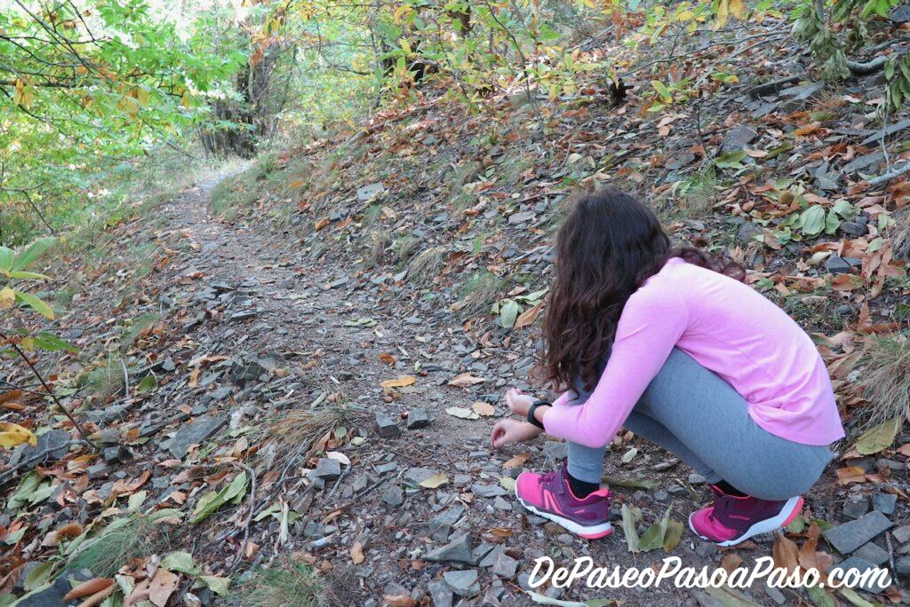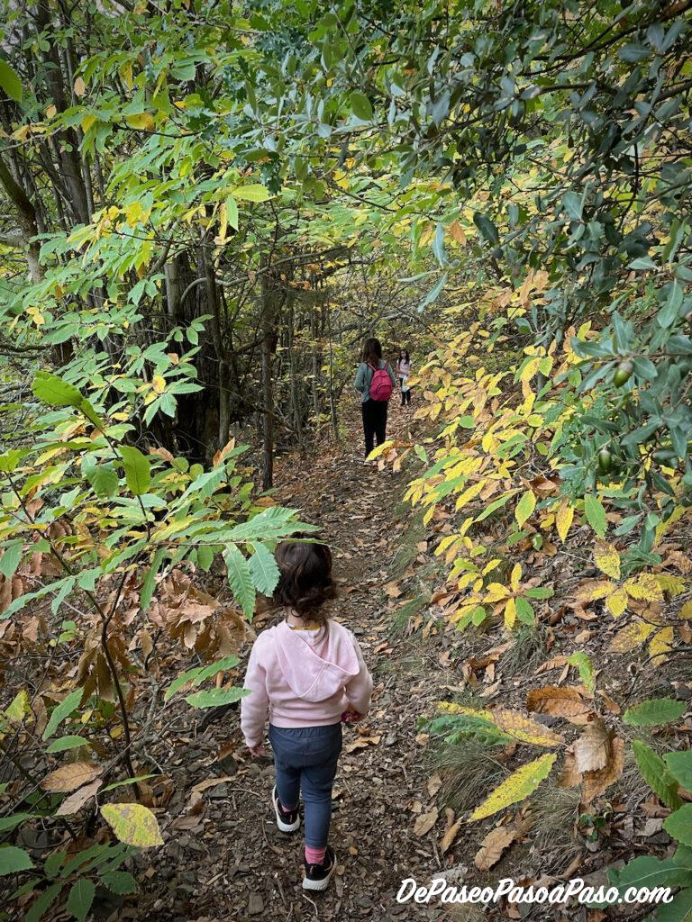 Luego de la primera decisión hacia la derecha, el camino cambia considerablemente, y comenzamos a caminar por dentro del bosque, encontrando los primeros castaños.
