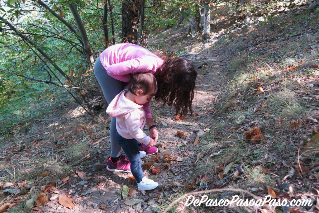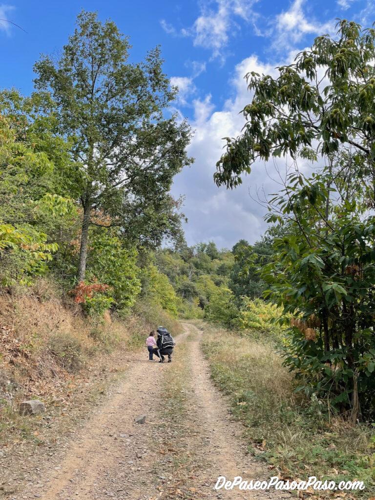 Este camino estaba bastante transitado, tanto por personas caminando como por vehículos. Hay castaños en los bordes del camino, pero ya no quedan castañas de fácil alcance, por lo que hay que trepar hacia la ladera de la montaña para encontrar castañas. Con las niñas no nos pareció muy seguro y la verdad es que no nos gustó mucho el paisaje tampoco. Por lo que luego de avanzar cerca de 2 km, y juntar algunas castañas que encontramos en el camino, decidimos dar la vuelta y volver a realizar (igual que el año pasado) la ruta de castaños en la que caminamos por dentro del bosque de castaños.